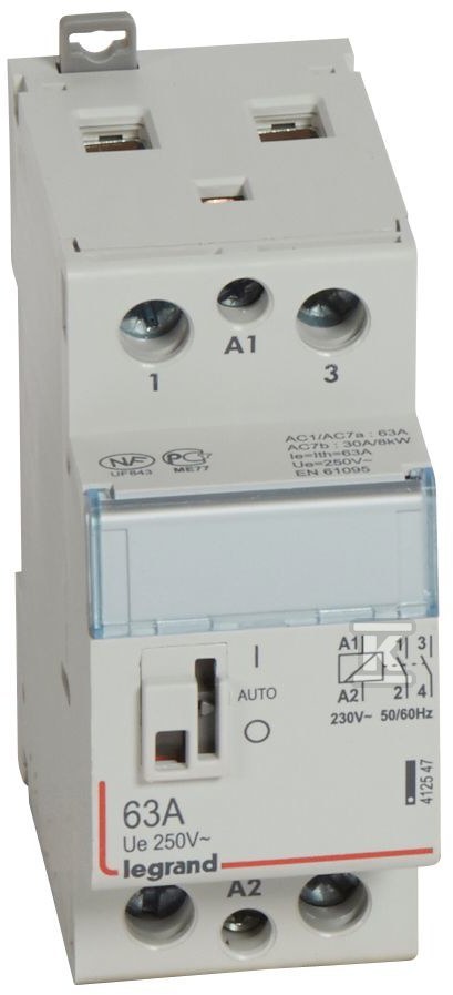 Номінальна робоча напруга становить 250 V, а номінальна керуюча напруга – діапазон від 195 до 253 V AC. Номінальний струм контактора – 63 A, він має два нормально відкритих контакти (NO) і займає ширину 2 модулів. Ступінь захисту – IP2X. Максимальна комутаційна здатність для ламп розжарювання становить 8000 Вт, а для люмінесцентних ламп 4700 VA (з компенсацією DUO навіть 5000 VA). Контактор оснащений маніпулятором, що полегшує обслуговування.