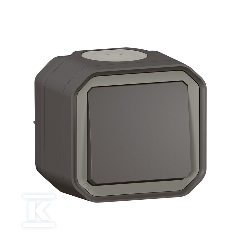 Виготовлений з безгалогенного пластику, перемикач відповідає нормі IK08 стійкості до ударів. Ступінь захисту IP55 гарантує захист від струменя води та пилу – що робить його ідеальним вибором для приміщень з підвищеною вологістю або схильних до забруднень. Номінальний струм 10A при напрузі 250V забезпечує безпечну роботу з типовими освітлювальними ланцюгами. Колір антрацит (RAL 7016) забезпечує естетичний вигляд і відповідність різноманітним інтер'єрним рішенням. Велика внутрішня площа корпусу полегшує прокладку кабелів, а гнучка мембрана забезпечує відмінне прилягання до стіни.