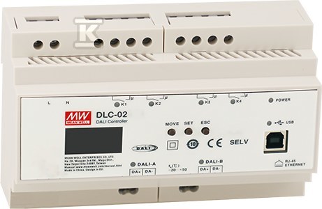 Контролер DLC-02 вирізняється багатим набором функцій, які дозволяють створювати складні світлові сцени та адаптувати освітлення до індивідуальних потреб. Вбудований РК-дисплей полегшує конфігурацію та моніторинг стану системи. Чотири вбудовані реле (250V/5A) розширюють можливості застосування пристрою, дозволяючи керувати додатковими ланцюгами. Конфігурація відбувається за допомогою порту USB та опціонально через вихід Ethernet, що забезпечує зручність і гнучкість під час встановлення та використання.