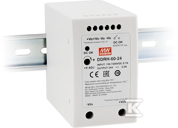 Перетворювач DDRH-60-24 – це високоякісний імпульсний блок живлення DC/DC, призначений для застосувань, що вимагають стабільної напруги 24V з ультраширокого діапазону вхідних напруг 150-1500VDC. Пристрій характеризується вихідною потужністю 60W і струмом 2.5A, що робить його ідеальним рішенням у фотоелектричних системах, вітрових установках, промисловій автоматиці та інших додатках, де виникає висока постійна напруга.