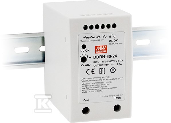 Конструкція перетворювача була збагачена низкою захистів: від короткого замикання, перевантаження, надмірної напруги та зворотної полярності. Крім того, він має ізоляцію We/Wy з витривалістю 4 kVDC, що підвищує безпеку використання. Можливість монтажу на DIN-рейку TS-35/7.5 або 15 полегшує встановлення та інтеграцію з існуючими системами. Пристрій також має реле DC OK, яке інформує про правильну роботу живлення. Завдяки високоякісним компонентам і міцній конструкції, перетворювач DDRH-60-48 забезпечує довготривалу та безвідмовну роботу – підтверджену 3-річною гарантією виробника.