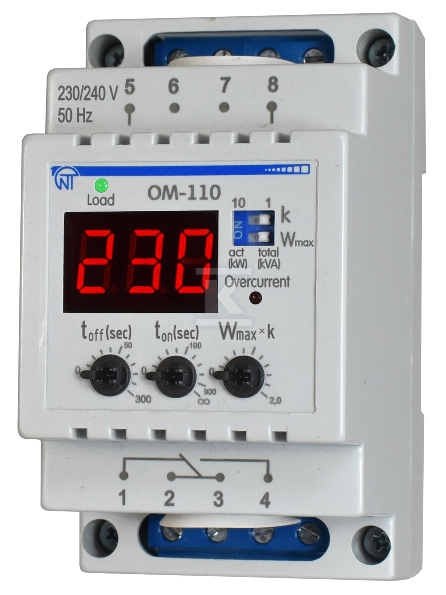 OM-110 вимірює активну або повну потужність в діапазоні від 0 до 20 кВт (або кВА), а у випадку перевищення визначеного порогу, автоматично відключає навантаження. Після закінчення встановленого часу затримки, пристрій може знову увімкнути навантаження або заблокувати повторне ввімкнення – все це налаштовується користувачем. Завдяки цьому мінімізується ризик аварій, спричинених перевантаженням, та оптимізується споживання енергії.