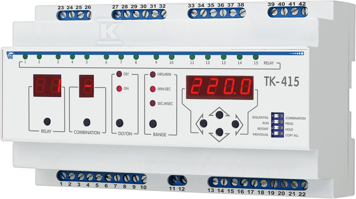 Таймер TK-415 пропонує широкий спектр конфігураційних можливостей. Перемикання між послідовним та комбінованим режимом відбувається дуже легко, що дозволяє швидко адаптувати пристрій до поточних потреб. Обладнаний 7-сегментним дисплеєм, що полегшує зчитування та моніторинг налаштувань. Пам'ять налаштувань – ще одна важлива особливість – таймер запам'ятовує конфігурацію навіть після зникнення живлення, що усуває необхідність повторного програмування.