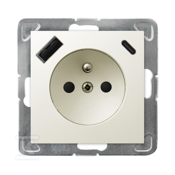 Одинарна розетка з заземленням та захисними пластинами для струмових шин, з USB-зарядним пристроєм A+C — ECRU IMPRESJA GP-1YZPUSBAC/M/27