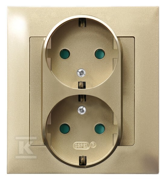 Подвійна розетка з заземленням Schuko з захисними пластинами на струмових каналах, у комплекті з рамкою — ЗОЛОТИЙ МЕТАЛІК ІМПРЕСІЯ GP-2YSP/28
