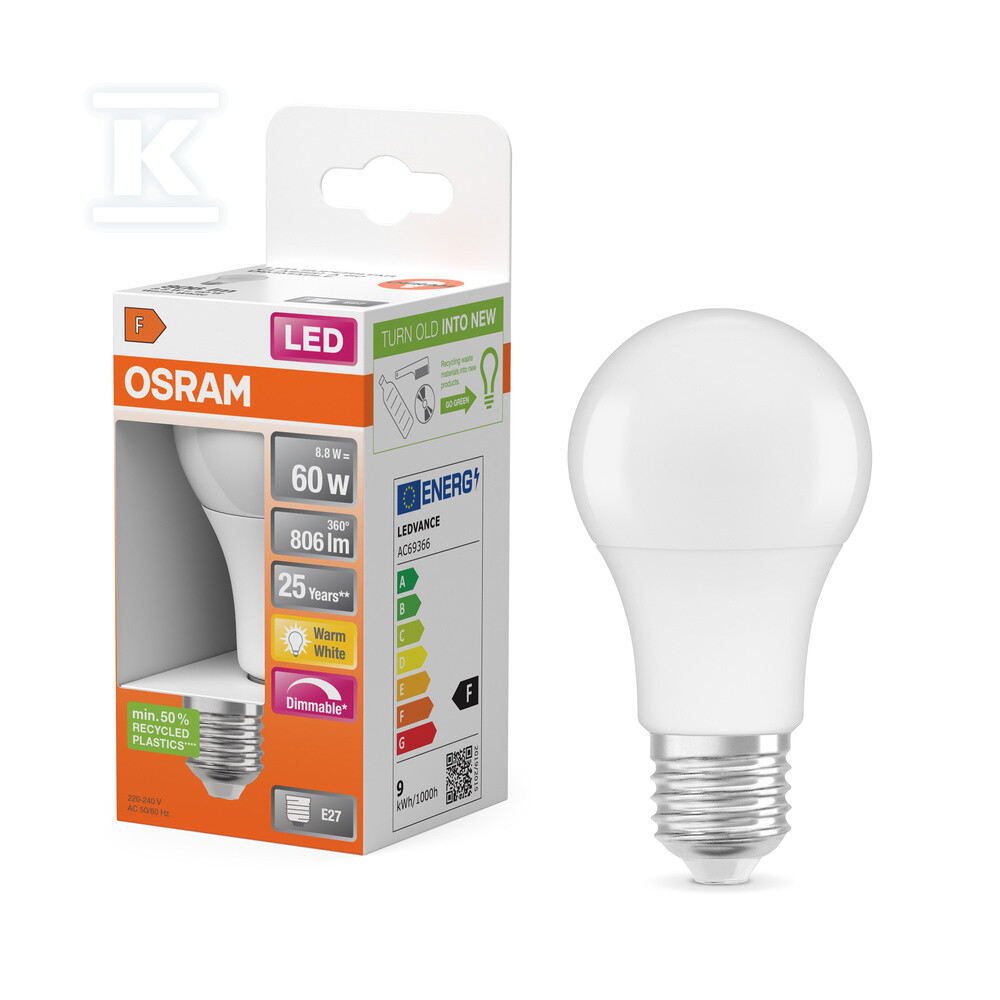Лампа виготовлена з пластику, отриманого з перероблених матеріалів, що робить її більш екологічною. Її конструкція у формі класичної лампи (A60) з матовою обробкою (frosted) забезпечує рівномірне розсіювання світла під кутом 200 градусів. Компактні розміри – 106 мм в довжину та 60 мм в ширину – дозволяють використовувати її в різних світильниках.