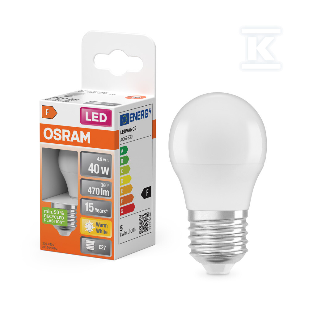 Лампочка LED STAR CLASSIC P 4.9W 827 з цоколем E27 є заміною традиційних лампочок потужністю 40W, а її світловий потік становить 470 lm. Виготовлена з пластику, що походить із переробки, що робить її більш екологічною. Матове покриття абажура забезпечує рівномірне розсіювання світла та усуває ефект засліплення. Її компактні розміри (довжина 79 мм, ширина 45 мм) дозволяють встановлювати в різних світильниках.