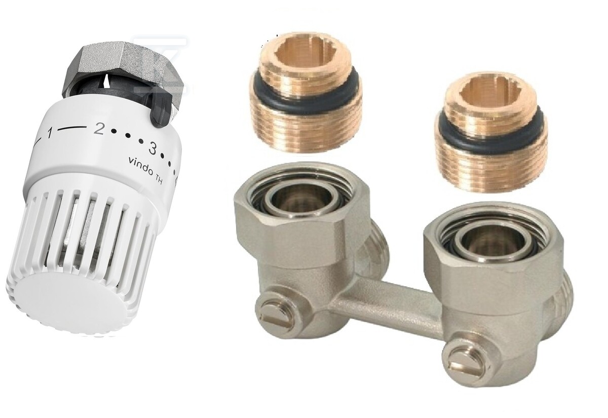 Цей комплект є повним рішенням для інсталяцій радіаторів з нижнім підключенням, забезпечуючи точне регулювання температури та зручність монтажу. Складається з термостата Vindo TH 01-5 та подвійного приєднання Multiflex FB, розробленого з урахуванням довговічності та надійності.