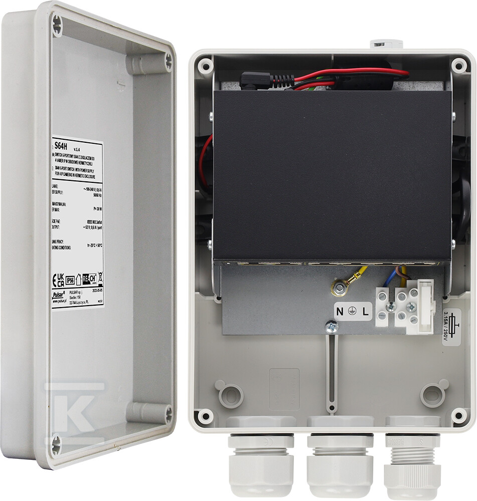Комутатор розміщений у герметичному корпусі (IP56), що робить його ідеальним рішенням для зовнішнього застосування, яке піддається впливу атмосферних умов. Корпус виготовлений з пластику і має гвинтове закриття, що забезпечує додатковий захист. Вбудований імпульсний блок живлення (PSCL520115 52VDC/1,15A/60W) та захист від короткого замикання (SCP), перевантаження (OLP) і перенапруги гарантують безпечну та надійну роботу пристрою. Крім того, можливість монтажу на стовп (за допомогою опціонального адаптера OZB2) підвищує гнучкість встановлення.