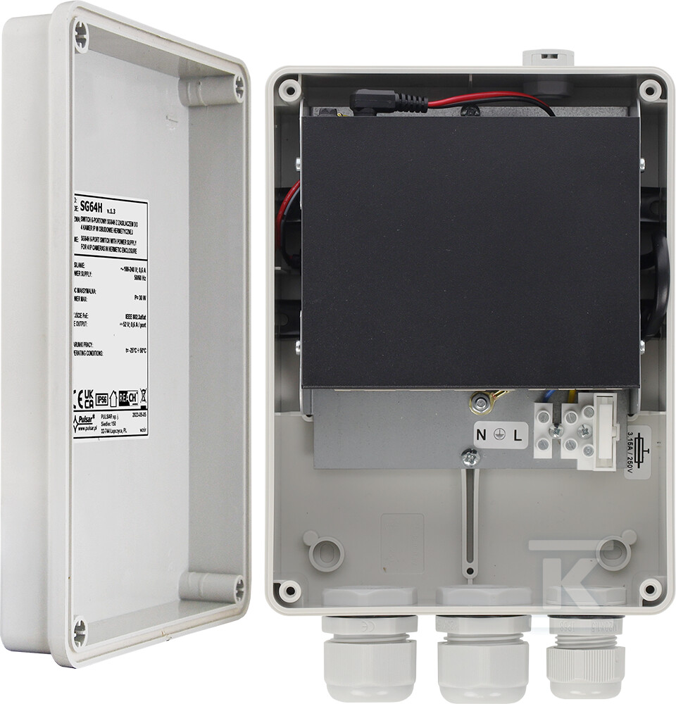 6-портовий комутатор SG64H з блоком живлення для 4 IP-камер у герметичному корпусі.