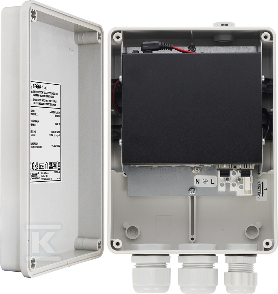 Комутатор SFG64H – це надійний пристрій, призначений для живлення та передачі даних у системах IP-відеонагляду. Він оснащений 6 портами, зокрема 4 портами PoE (Power over Ethernet) та 2 портами SFP UPLINK, що забезпечує гнучкість та продуктивність при побудові мережі. Пристрій розміщено у міцному, герметичному корпусі (IP56), що робить його ідеальним рішенням як для внутрішнього, так і для зовнішнього застосування.