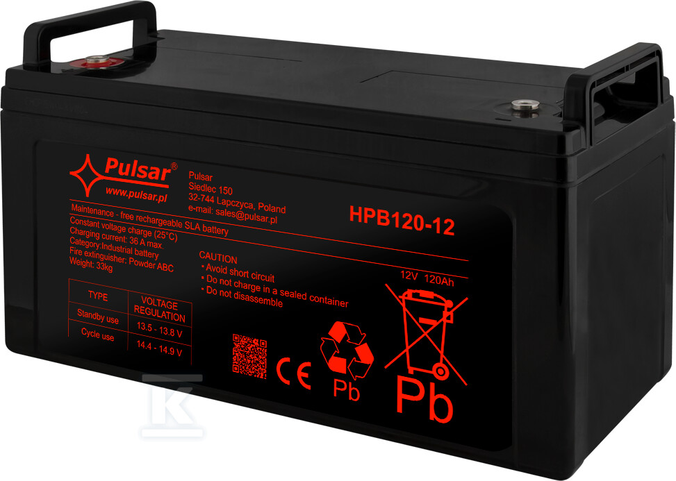 Цей кислотно-свинцевий акумулятор, виготовлений за технологією AGM, є надійним джерелом буферної та резервної енергії. Призначений для використання в системах протипожежного захисту, сигналізації, моніторингу (CCTV, SSWiN, KD), джерелах безперебійного живлення (UPS) та автоматиці. Його конструкція мінімізує потребу в обслуговуванні, а технологія AGM дозволяє встановлювати в місцях з природною вентиляцією. Акумулятор HPB120-12 є надійним рішенням як для професійних установників, так і для кінцевих користувачів, які шукають довговічне та безпечне живлення.