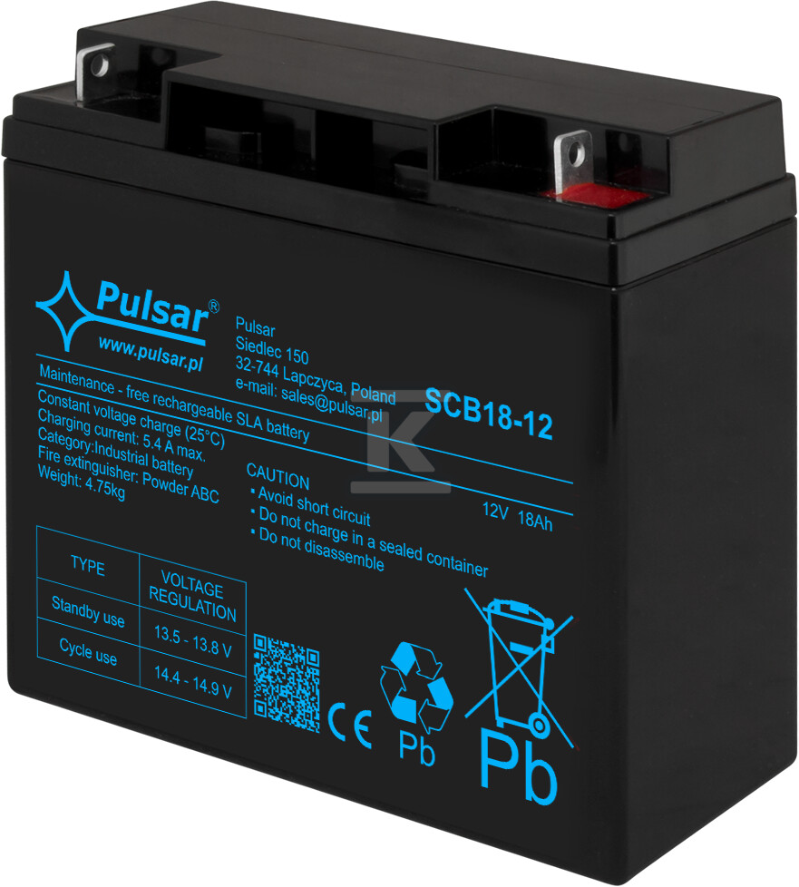 Акумулятор SCB18-12 характеризується номінальною напругою 12V і ємністю 18Ah. Рекомендований струм заряджання – 1,8A, а максимальний – 5,4A. Напруга заряджання для буферної роботи становить від 13,5V до 13,8V DC, а для циклічної роботи від 14,4V до 14,9V DC. Термін служби акумулятора становить від 3 до 5 років при температурі 20°C. Завдяки конструкції VRLA з запобіжними клапанами, акумулятор є безпечним у використанні та мінімізує ризик витоку електроліту. Додатково дозволений до транспортування авіаційним, морським та наземним транспортом відповідно до чинних правил (IATA/ICAO Special Provision A67, DOT-CFR Title 49 parts 171-189, IMDG Amendment 27). Гарантія виробника становить 1 рік з дати продажу.