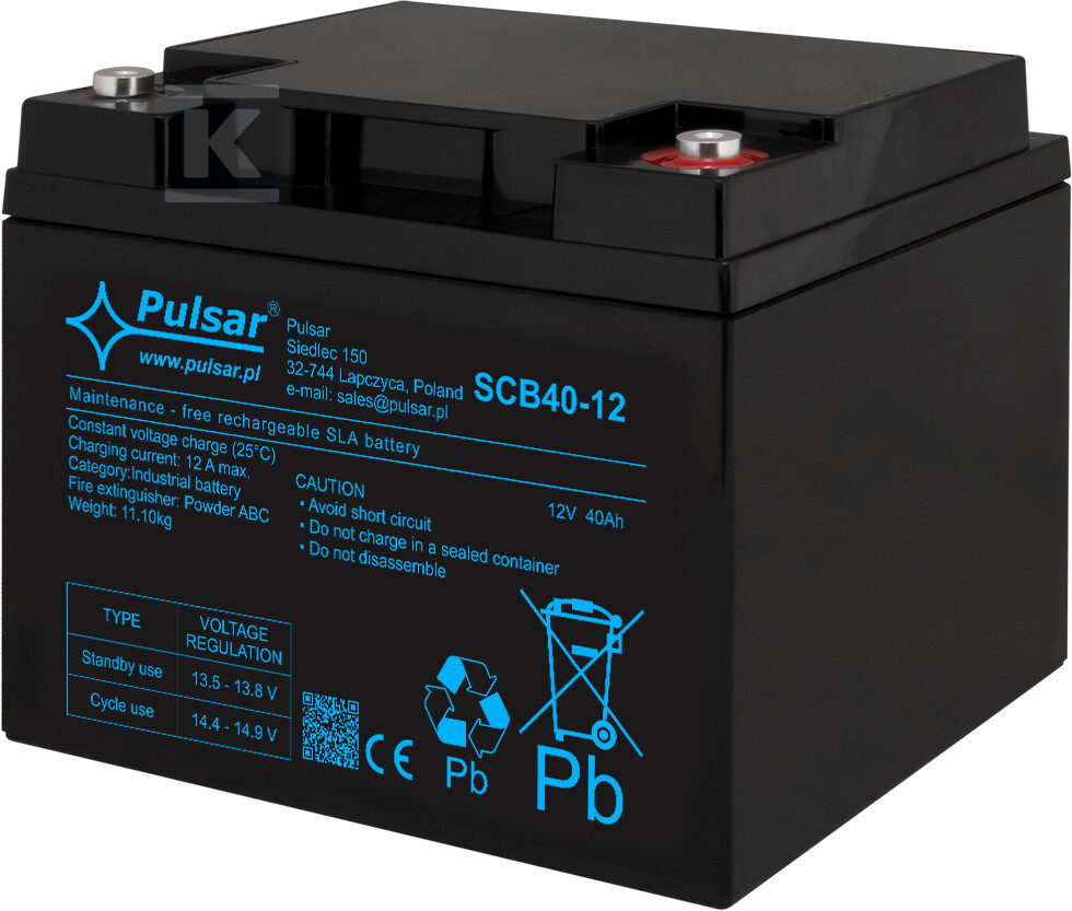 Акумулятор SCB40-12 – це без обслуговування свинцево-кислотний акумулятор (VRLA) в технології AGM, розроблений для застосувань, що вимагають надійного резервного живлення. Він чудово підійде для систем сигналізації (CCTV, SSWiN, KD), джерел безперебійного живлення (UPS), автоматики та інших пристроїв, де важливо підтримувати напругу під час перебоїв в електропостачанні. Конструкція з скляним матом (AGM) забезпечує мінімальне обслуговування та можливість монтажу в різних орієнтаціях, навіть у місцях з обмеженою вентиляцією.
