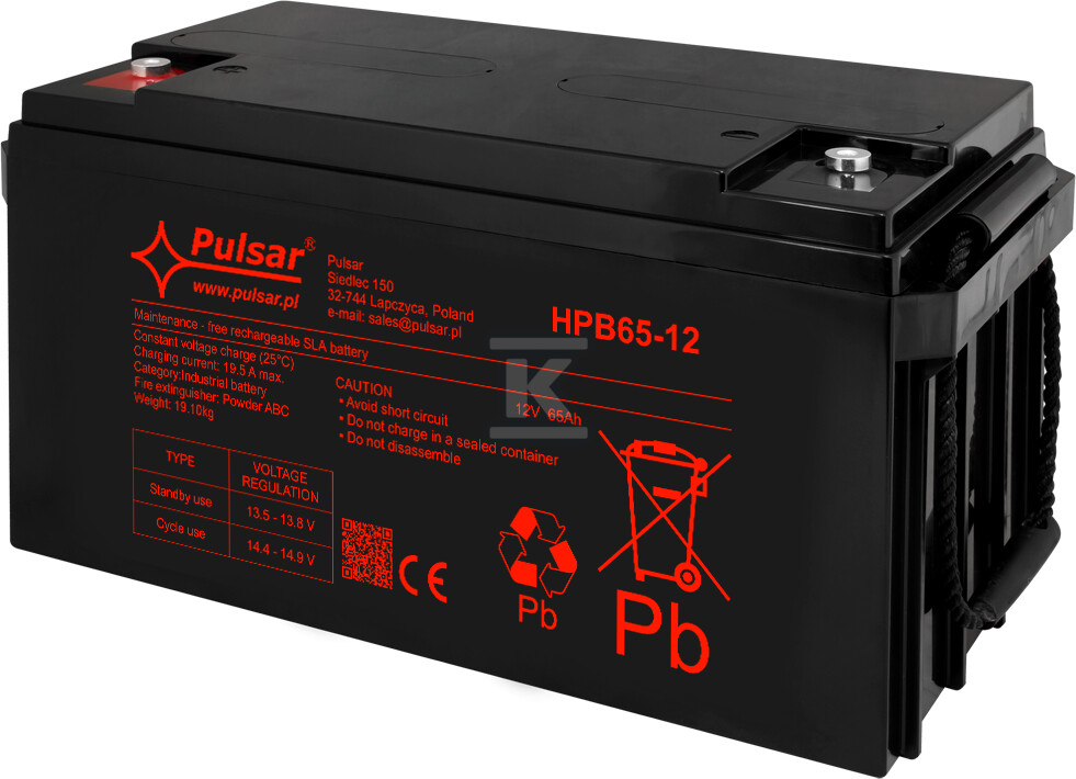 Акумулятор HPB65-12 використовує технологію AGM (Absorbent Glass Mat), в якій електроліт поглинається скляним матом. Це рішення забезпечує ефективну рекомбінацію газів, мінімізуючи ризик витоків і продовжуючи термін служби пристрою. Завдяки цьому акумулятор може працювати в приміщеннях з природною вентиляцією, без необхідності регулярного доливання електроліту. Його розміри (349 x 178 x 167 мм) дозволяють легко монтувати в більшості стандартних корпусів. Рекомендований струм зарядки – 6,5A, а максимальний – 19,5A. Призначений для роботи при температурі від 0°C до 40°C під час заряджання та від -15°C до 50°C під час розряджання.