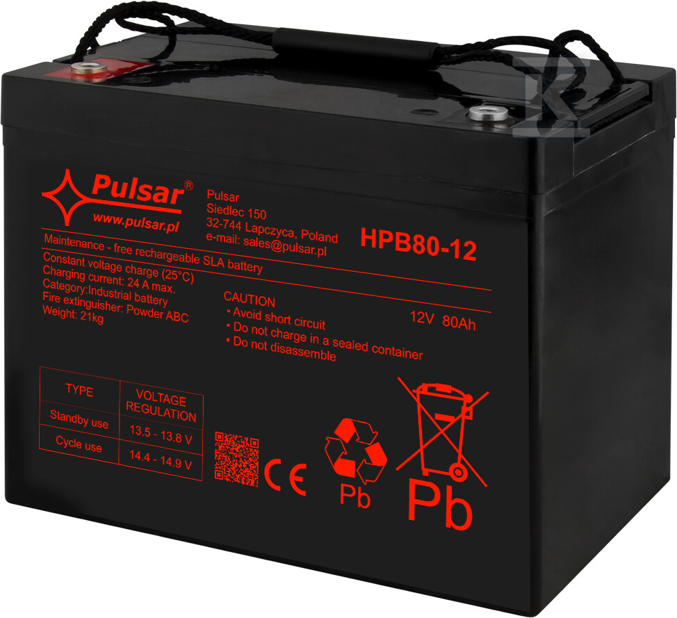 Акумулятор HPB80-12 використовує технологію AGM (Absorbent Glass Mat), де електроліт абсорбується сепаратором з скловолоконної мати. Така конструкція усуває ризик витікання електроліту, а також дозволяє акумулятору працювати в будь-якому положенні. Завдяки цьому це безпечне та зручне в монтажі рішення. Ці акумулятори характеризуються високою стійкістю до циклів заряджання та розряджання, що перекладається на тривалий термін служби – до 5-8 років при правильній експлуатації при температурі 20°C. Крім того, вони дозволені до авіаційного, морського та наземного транспортування відповідно до чинних норм (IATA/ICAO Special Provision A67, IMDG Special Provision 238, ADR/RID).