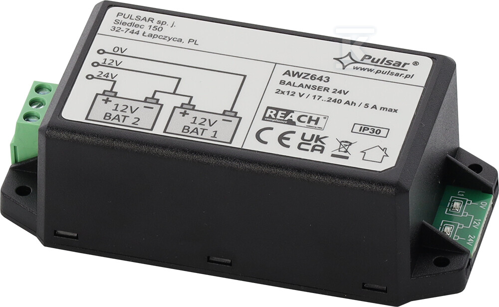 Балансувальник AWZ643 є ідеальним рішенням як для вимогливих установників систем живлення аварійного живлення, так і для користувачів, які піклуються про надійність своїх джерел енергії. Він дозволяє оптимізувати роботу акумуляторів в системах сигналізації, джерелах безперебійного живлення (UPS), а також в транспортних засобах для відпочинку та човнах.