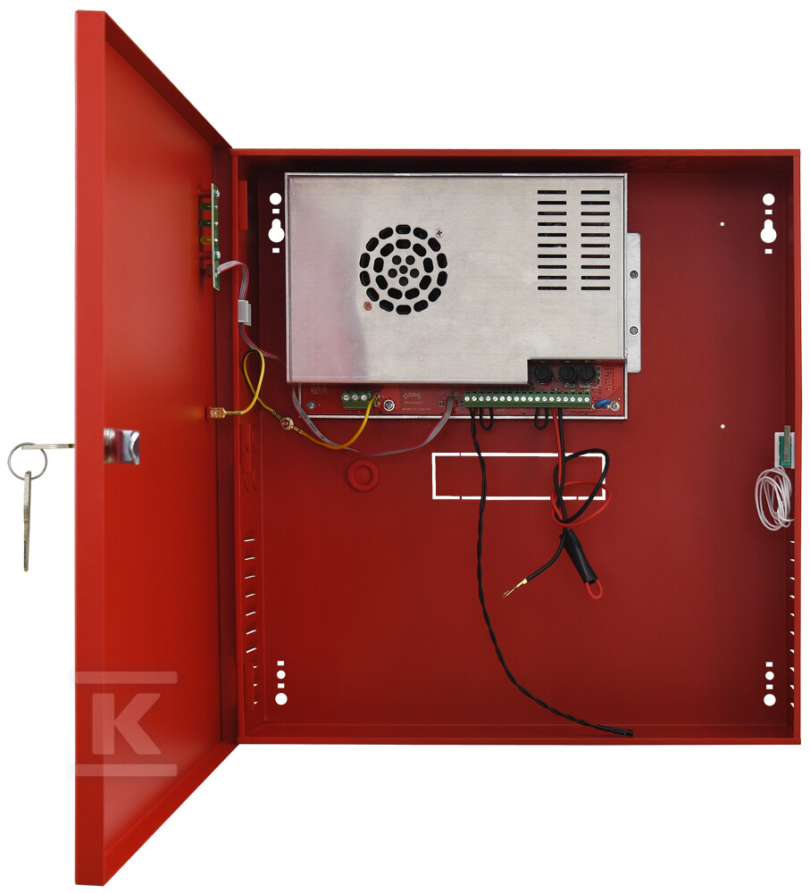 Блок живлення характеризується міцним металевим корпусом (сталь DC01, RAL3001 – червоний), який захищає внутрішні компоненти від механічних пошкоджень і впливу навколишнього середовища. Вбудовані захисти від короткого замикання (SCP), перевантаження (OLP), надмірної напруги (OVP) та надмірного розряду акумуляторів (UVP) забезпечують довготривалу та безпечну експлуатацію. Додатково, функція tamper – сигналізація відкриття корпусу – підвищує рівень безпеки установки. Два незалежні виходи AUX1 і AUX2 з вихідним струмом 9,2 A (безперервна робота) або 10 A (тимчасова робота) дозволяють живити різні елементи системи протипожежного захисту.