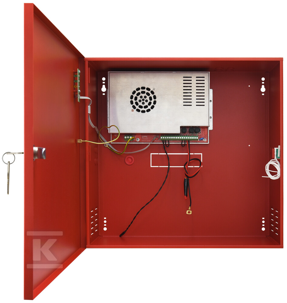 Блок живлення розміщений у міцному, червоному сталевому корпусі (RAL 3001), пристосованому для настінного монтажу. Всередині є місце для двох акумуляторів 12V з ємністю 40Ah (акумулятори не входять до комплекту). Пристрій характеризується високою ефективністю (до 89%) і мінімізує втрати енергії. Струм заряджання акумуляторів становить 1,8A. Вбудовані захисти – SCP, OLP, OVP, UVP та tamper – захищають установку від пошкоджень і несанкціонованого доступу. Додатково має технічні виходи, що сигналізують про аварії мережі AC і загальні, а також вхід для сигналу зовнішньої аварії.