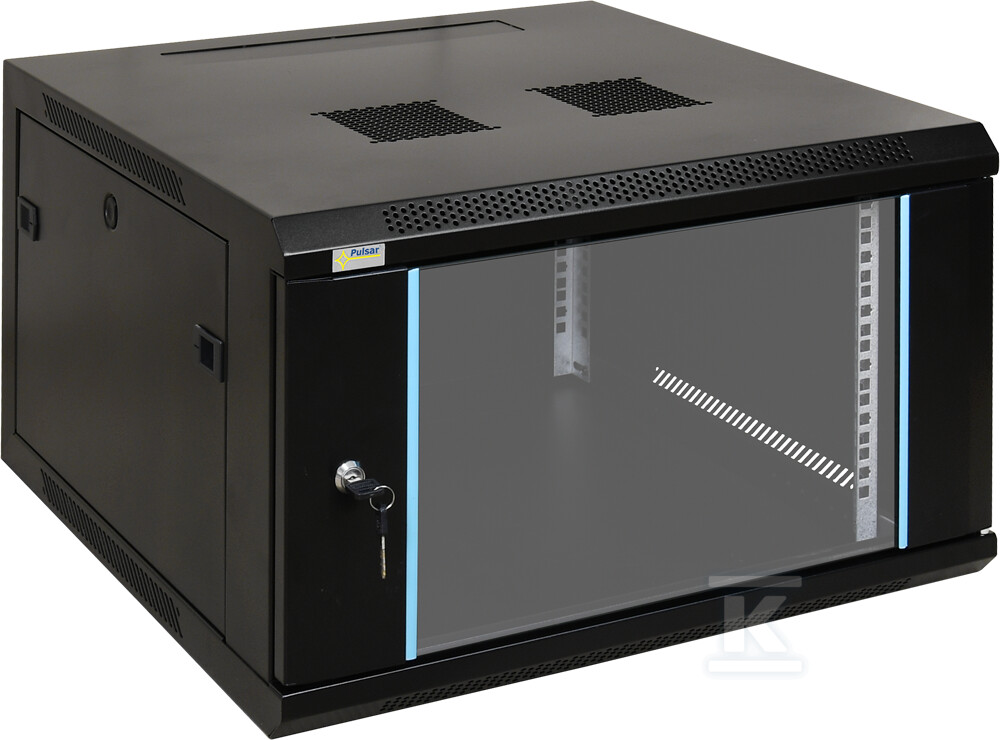 Шафа виготовлена зі сталі, що прокатується на холоді SPCC товщиною 1.2mm і 1.5mm, що гарантує міцність і стійкість до корозії. Оздоблення в кольорі RAL9004 (чорний) надає їй елегантний вигляд. Зовнішні розміри шафи становлять 600 x 368 x 600 mm (+/-2 mm), а монтажні розміри – 19" x 6U x 447mm. Статичне навантаження становить 70 кг, що дозволяє безпечно розмістити всередині значну кількість пристроїв. Фронтальні двері оснащені замком (RAZ25 – той самий код), а бічні мають систему Click, що дозволяє опціонально встановити замок (RAZB16).