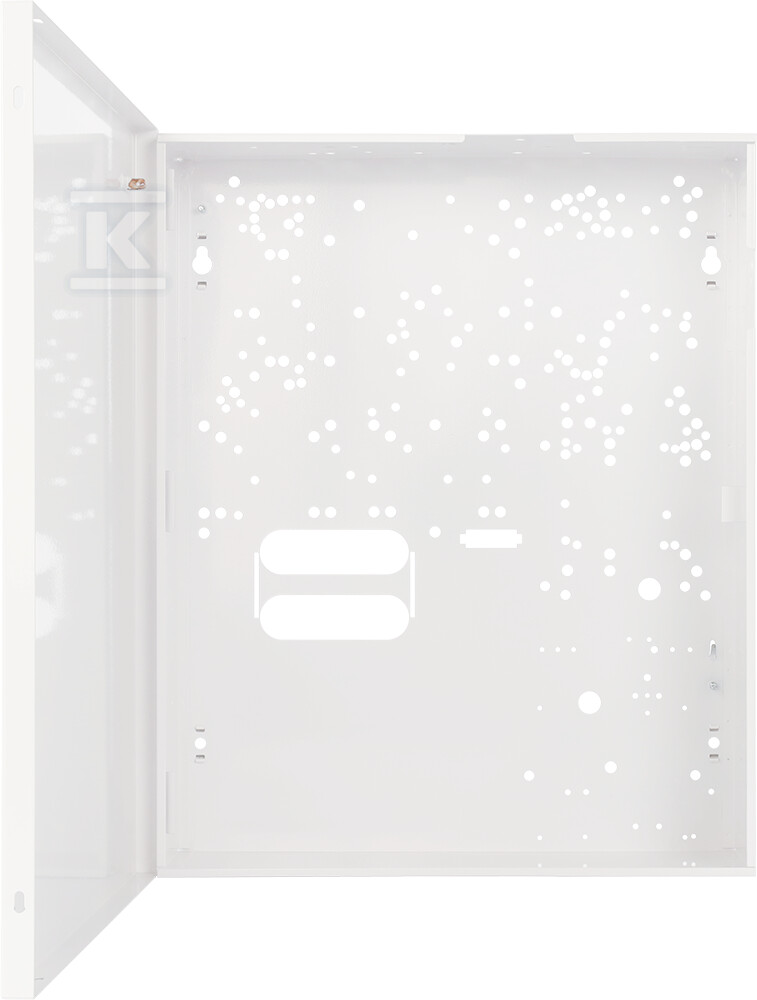 Зовнішні розміри корпусу становлять 320 x 400 x 90 мм (плюс 8 мм відстані від стіни), а внутрішні розміри передньої панелі – 325 x 405 мм. Конструкція дозволяє легко монтувати центральні блоки сигналізації популярних брендів, таких як Satel, Risco, DSC, Paradox, Pyronix, EBS, Telmor або Roger. Підготовлені монтажні отвори полегшують встановлення додаткових модулів. Корпус скріплюється за допомогою саморізів (6 шт.) або може бути оснащений опціональним замком (MR008 / MR027). Додатково є можливість встановлення тампера відриву від підлоги (PKAZ066) для підвищення безпеки.