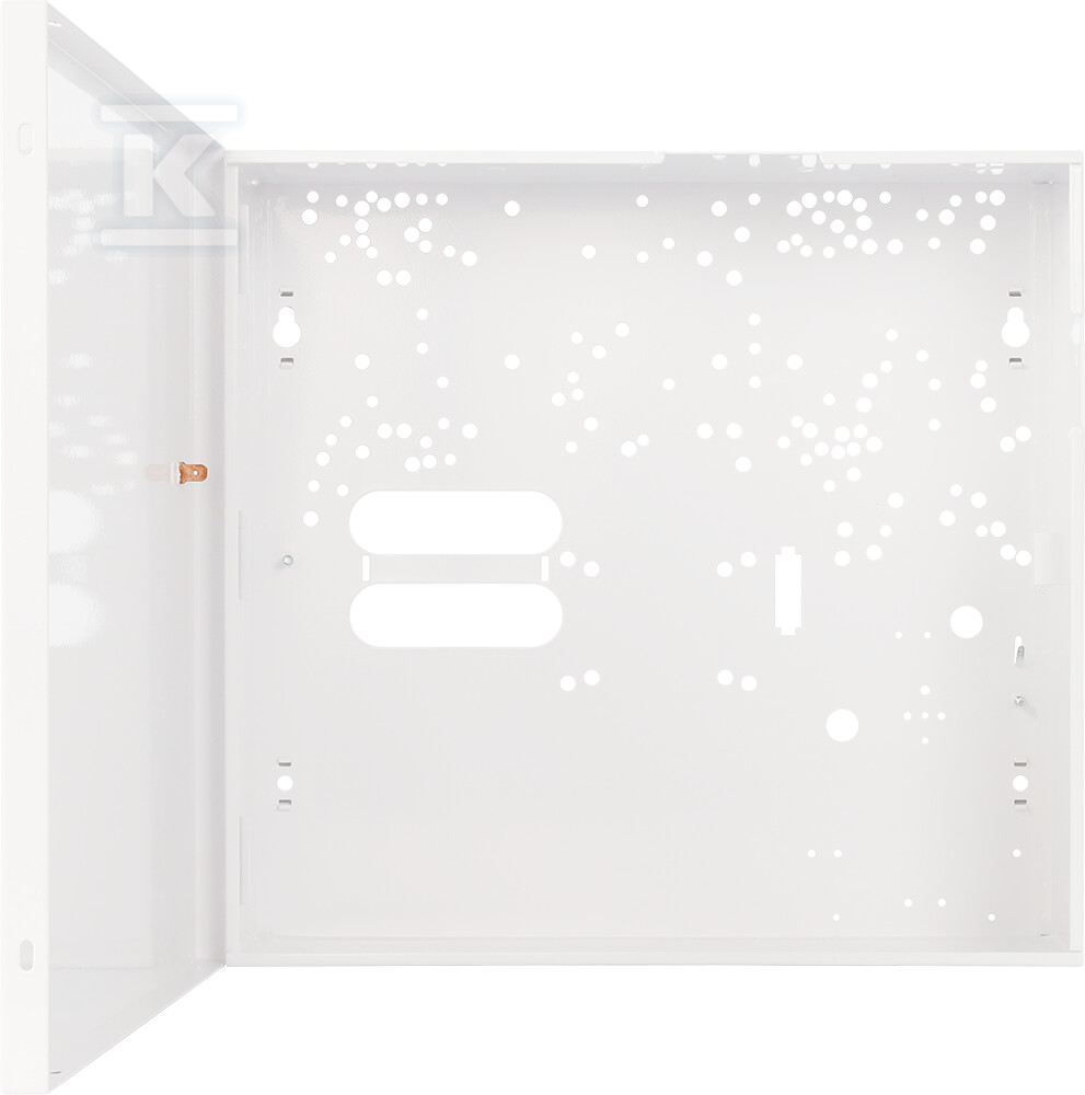 Виготовлений зі сталевого листа товщиною 0.7 мм і покритий білою фарбою (RAL9003), корпус характеризується міцністю та стійкістю до корозії. Всередині є місце для акумулятора ємністю 17Ah, що гарантує надійне живлення системи в разі відключення електроенергії. Вбудований трансформатор TRP 40VA (16V/18V) забезпечує стабільну напругу живлення для централі та модулів. Відстань від підлоги, що становить 8 мм, полегшує прокладку кабелів і покращує вентиляцію. Крім того, корпус має захист від саботажу у вигляді мікровимикача відкриття та можливість монтажу тампера відриву від підлоги (PKAZ066). Закриття корпусу здійснюється за допомогою скріпленої конструкції – опціонально можна встановити замок для додаткової безпеки.