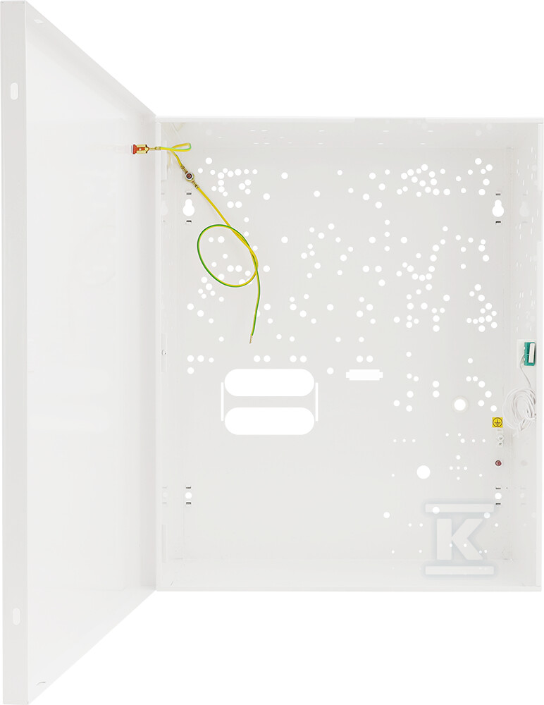 Корпус виготовлений зі сталевого листа DC01 товщиною 0.7mm і покритий покриттям RAL9003 (білий), що забезпечує естетичний вигляд і стійкість до корозії. Використання високоякісних матеріалів гарантує довговічність і надійність конструкції. Всередині є простір для акумулятора ємністю 17Ah/12V або 7Ah/12V, що дозволяє забезпечити безперервність роботи системи в разі зникнення живлення. Додатково, корпус має захист від несанкціонованого відкриття – відкриття його запускає тривогу, а опціонально можна встановити датчик відриву від підлоги PKAZ066 для додаткового захисту. Закриття корпусу відбувається шляхом скріплення – також є можливість встановлення замка для підвищення безпеки.