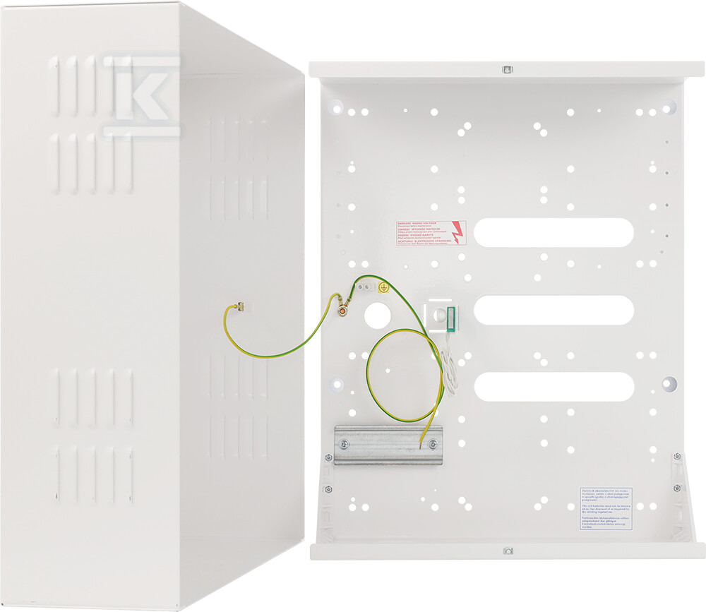 Обudова виготовлена з листової сталі DC01 товщиною 1,0 мм, що гарантує її міцність та стійкість до механічних пошкоджень. Антикорозійний захист та порошкове фарбування в колір RAL 9003 (білий) забезпечують довговічність та естетичний вигляд. Настінний монтаж простий та швидкий – обudова має відстань від стіни (підлоги) висотою 15 мм, що полегшує прокладання кабелів. Закриття скріплюється за допомогою циліндричних гвинтів, що забезпечує додаткову безпеку.