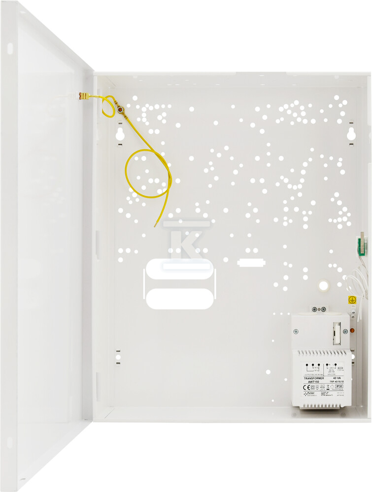 Вбудований трансформатор TRP 40VA забезпечує стабільне живлення для централі сигналізації. Пропонує два вихідні напруги: 16V AC / 2.2A та 18V AC / 2A, що дозволяє адаптуватися до вимог різних пристроїв. Корпус сумісний з широким спектром централей сигналізації та модулів різних виробників, що робить його універсальним рішенням для різноманітних інсталяцій. Закриття корпусу здійснюється шляхом скріплення, а опціонально можна встановити замок для додаткової безпеки.