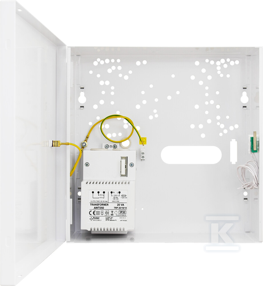Корпус розроблений для співпраці з широким спектром централей сигналізації популярних брендів, таких як Satel, Risco, DSC, Paradox, Pyronix або Crow. Всередині ви знайдете спеціальне місце для акумулятора ємністю до 7Ah та вбудований трансформатор TRP 20VA/16V/18V. Це рішення дозволяє створити повну та незалежну систему живлення. Трансформатор забезпечує вихідні напруги 18V AC / 1A або 16V AC / 1.2A, адаптуючись до вимог різних пристроїв.