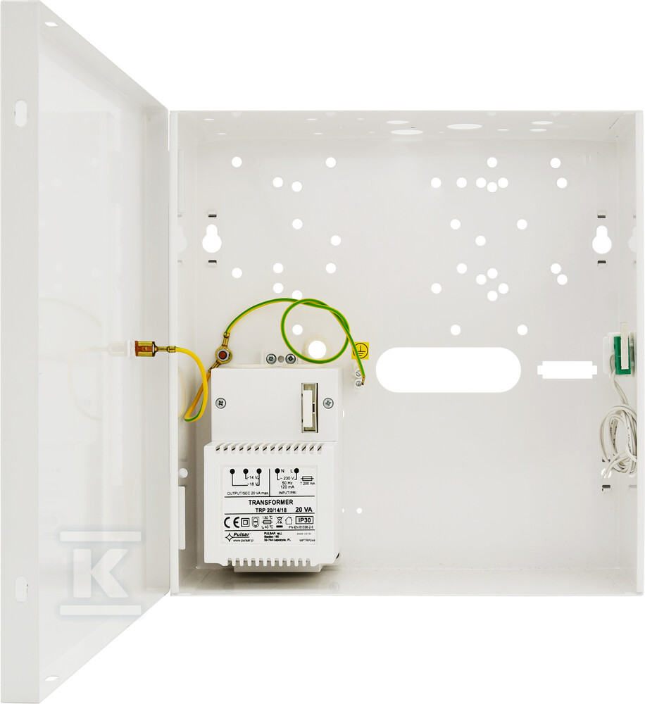Корпус оснащений мікровимикачем антисаботажу (NC – нормально замкнутий контакт), який сигналізує про спробу відкриття або відриву від стіни (при застосуванні додаткового модуля PKAZ066). Це забезпечує додатковий рівень безпеки системи. Трансформатор потужністю 20VA/14V/18V (відповідно до норми EN 61558-2-6) дозволяє живити підключені пристрої. Варто звернути увагу на можливість підключення вторинних напруг U1 або U2 (14V або 18V) та струмів I1 або I2 (1,4A або 1,0A), що забезпечує сумісність з різними пристроями. Корпус має ступінь захисту IP20.