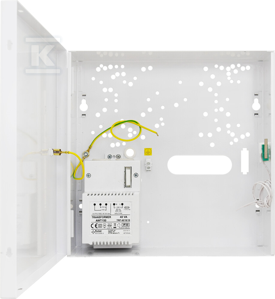 Корпус AWO009 виготовлений з листової сталі DC01 товщиною 0,7 мм, що гарантує його міцність та стійкість до пошкоджень. Призначений для настінного монтажу всередині приміщень (клас IP20). Всередині є місце для акумулятора ємністю до 7Ah/12V, що забезпечує безперервність роботи системи навіть у разі відключення живлення. Вбудований трансформатор TRP 40VA/16V/18V стабілізує напругу та забезпечує відповідну потужність для підключених пристроїв.