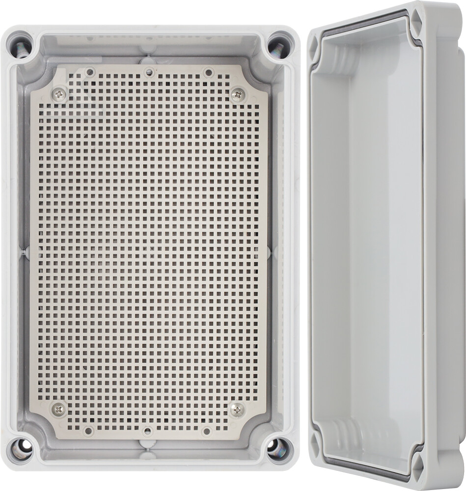 Корпус AWB382813 характеризується розмірами 380x280x130 мм і оснащений знімною монтажною платою розмірами 250x350 мм з квадратною перфорацією. Це дозволяє легко монтувати компоненти та гнучко розміщувати пристрої всередині корпусу. Закриття корпусу здійснюється за допомогою чотирьох пластикових гвинтів, що забезпечує швидкий доступ до внутрішнього простору та безпечне закриття. Монтаж корпусу простий – його можна змонтувати безпосередньо до підлоги або використати додаткові монтажні кронштейни (доступні окремо). Варто пам'ятати про ущільнення гвинтів під час безпосереднього монтажу, щоб зберегти герметичність IP66.