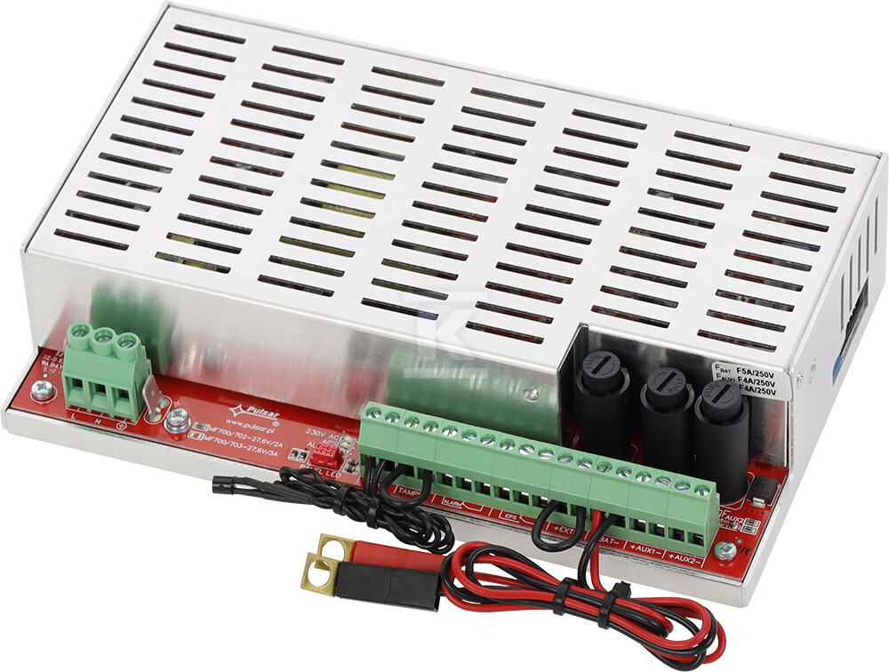Модуль оснащений низкою захистів, таких як SCP (захист від короткого замикання), OLP (захист від перевантаження), OVP (захист від перенапруги) та UVP (захист від занадто низької напруги). Додатково має незалежно захищені виходи AUX1 та AUX2, що забезпечують напругу 27.6V DC із сумарною вихідною потужністю – постійна робота 1A, тимчасова робота 2A. У разі зникнення напруги мережі відбувається автоматичне перемикання на живлення від акумулятора, забезпечуючи безперервність роботи системи. Оптичні сигналізації (опціональна панель LED EN54M-LED) та технічні виходи EPS (аварія мережі AC), ALARM (загальна аварія) та EXTi (зовнішня аварія) дозволяють швидко ідентифікувати потенційні проблеми та реагувати на них. Блок живлення також має функцію вимірювання опору ланцюга акумуляторів та автоматичну температурну компенсацію заряджання акумуляторів.