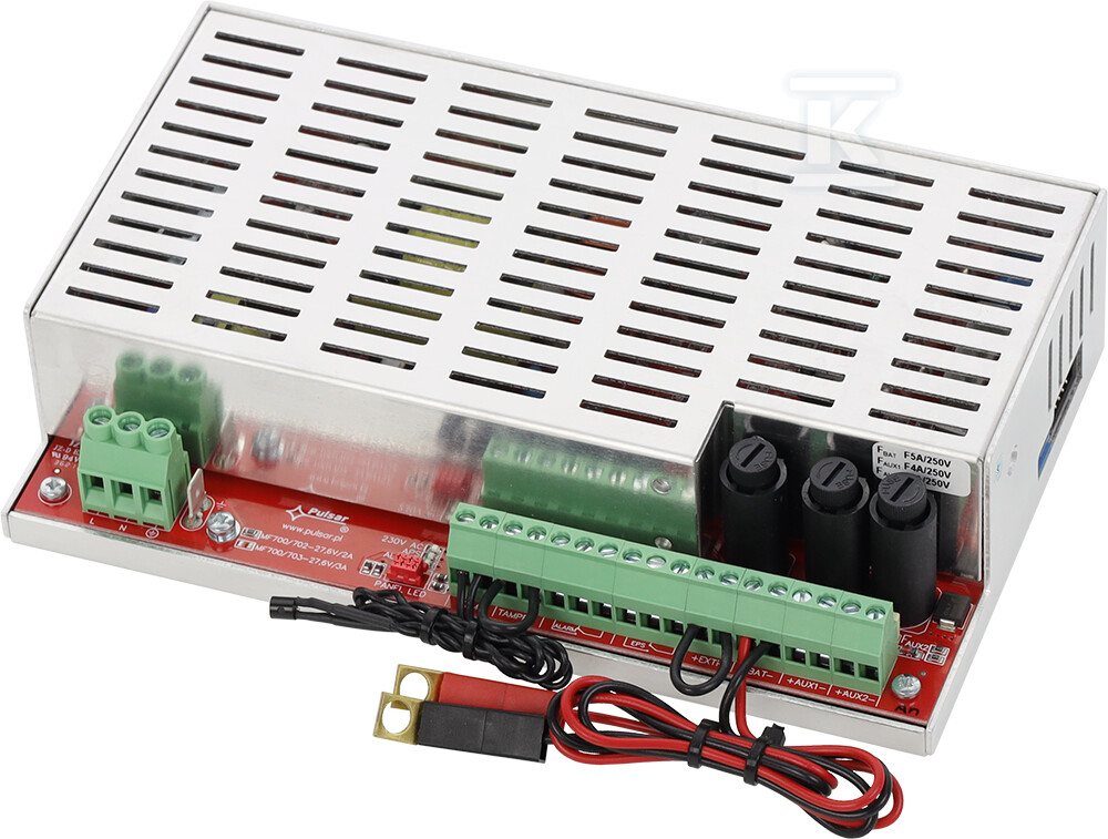 Модуль EN54M-2A7 характеризується високою ефективністю (до 89%) та низьким рівнем пульсацій напруги. Він має два незалежно захищені виходи AUX1 та AUX2, що підвищує стійкість системи до відмов окремих елементів. Вбудований мікропроцесор керує процесом заряджання акумуляторів, забезпечуючи оптимальне використання їхньої ємності та продовжуючи термін служби. Крім того, блок живлення контролює стан акумуляторів, сигналізуючи про низьку напругу (LoB) та захищаючи їх від надмірного розряду (UVP).