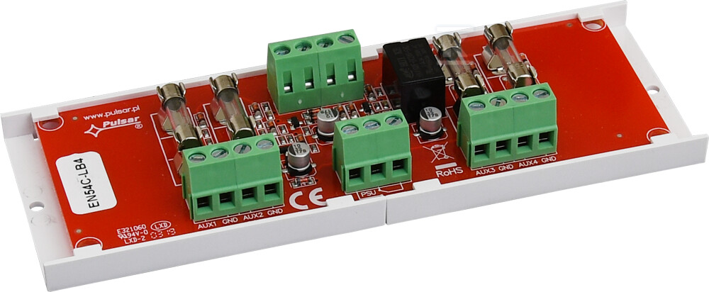 Модуль EN54C-LB4 має два входи живлення (IN1 і IN2), які дозволяють гнучке підключення до плати джерела живлення. Кожен вхід живить два незалежні виходи AUX (AUX1-AUX2 для IN1 та AUX3-AUX4 для IN2). Кожен вихід захищений від короткого замикання за допомогою плавкого запобіжника 0,5A (можливе використання запобіжників до 1A). Вбудовані світлодіоди сигналізують стан кожного виходу (L1-L4), а червоний світлодіод PSU інформує про пошкодження запобіжника. Додатково, модуль оснащений релейним виходом PSU, який може бути використаний для віддаленої сигналізації аварії – наприклад, шляхом підключення зовнішнього оптичного сигналізатора.
