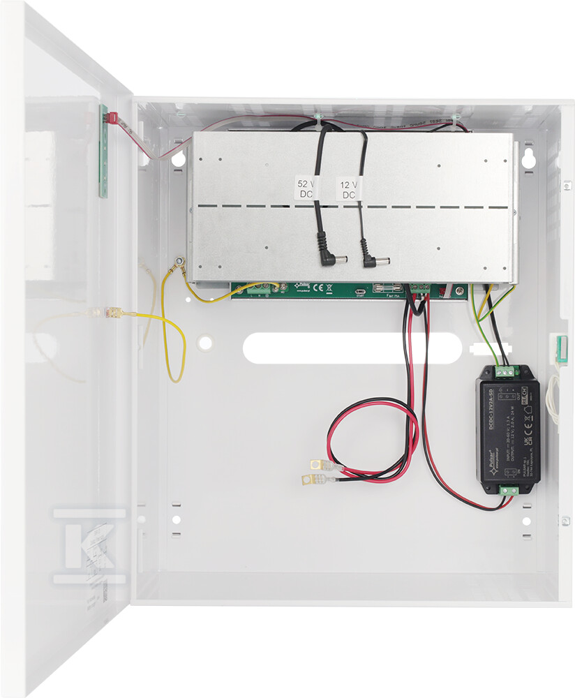 Це надійне рішення, призначене для забезпечення безперебійного живлення комутаторів PoE та реєстраторів. Система, заснована на імпульсному блоці живлення з перетворювачем DC/DC, гарантує стабільну напругу 52V DC для мережевих пристроїв та 12V DC для реєстратора. Така конструкція дозволяє обмежити кількість необхідних акумуляторів до двох штук, знижуючи тим самим експлуатаційні витрати. Корпус, виготовлений зі сталевого листа (або ABS в інших варіантах), пропонує місце для двох акумуляторів 17Ah/12V (або 12Ah/12V залежно від моделі) та оснащений мікроперемикачем, що сигналізує про відкриття дверцят.