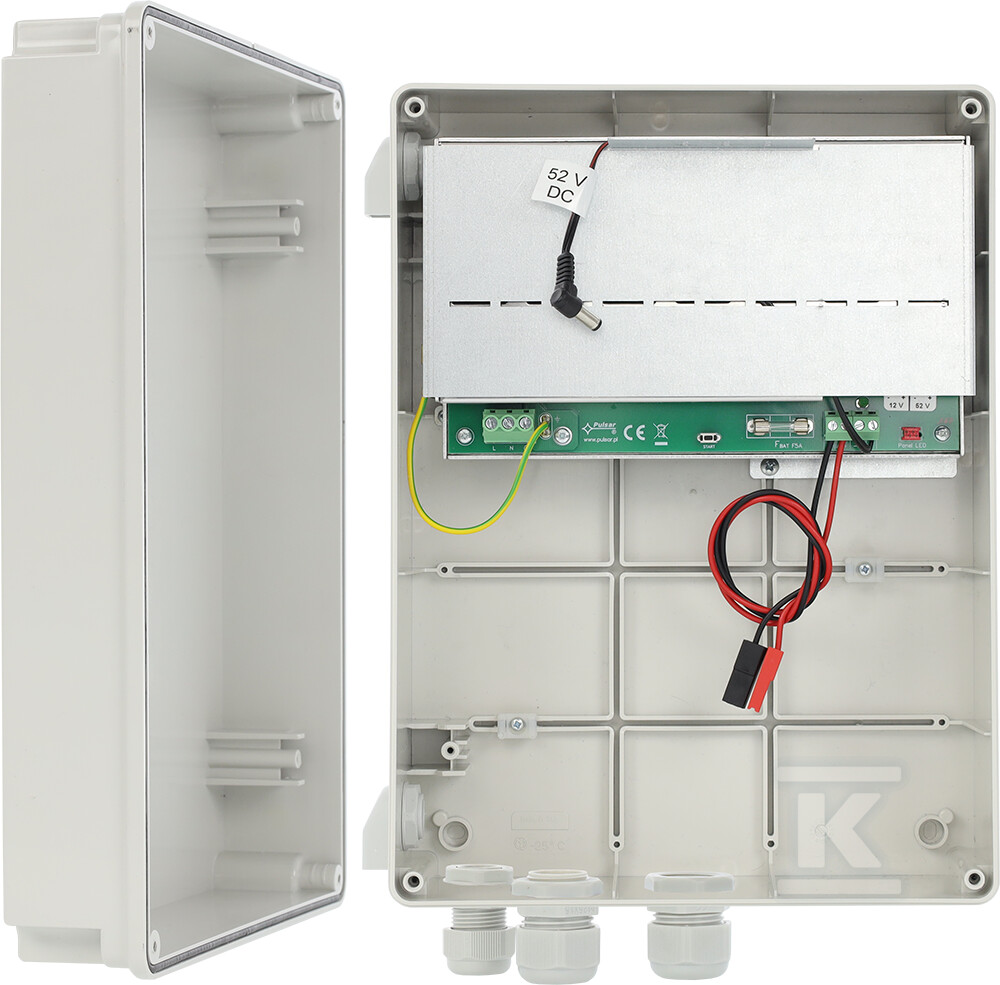 Система SWBH-60 – це компактний пристрій, розміщений у міцному корпусі ABS зі ступенем захисту IP44. Це означає, що він стійкий до бризок та пилу, що дозволяє встановлювати його в різних умовах навколишнього середовища. Всередині корпусу є місце для акумулятора 7Ah/12V (акумулятор необхідно придбати окремо), який у разі зникнення напруги в мережі автоматично переходить на живлення від батареї. Вбудований зарядний пристрій для акумулятора забезпечує його правильну роботу та продовжує термін служби. Провід живлення зі штекером JACK 5,5/2,1 додається до комплекту. Функція START дозволяє вручну переключити живлення в батарейний режим – корисна під час тестування або обслуговування.