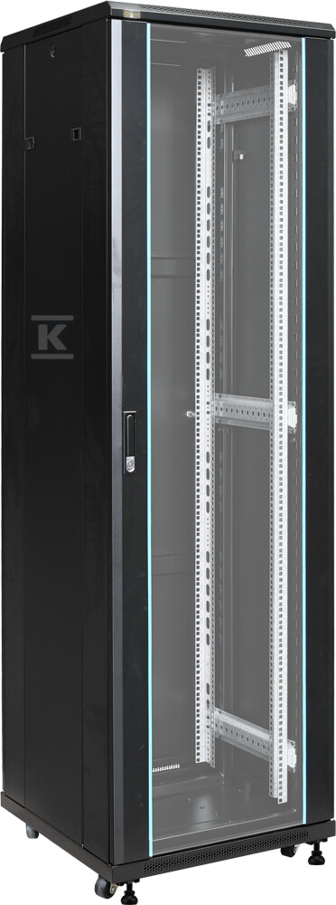Шафа має статичне навантаження до 1000 кг, що дозволяє безпечно розмістити навіть важке обладнання. У комплекті є чотири коліщатка без блокування та чотири регульовані ніжки, що забезпечують легке переміщення та вирівнювання шафи. Додатково, вентиляційні отвори у верхній та нижній плитах, а також у передніх дверях, забезпечують належну циркуляцію повітря та запобігають перегріву пристроїв. Можливість монтажу панелі вентиляторів додатково покращує охолодження.