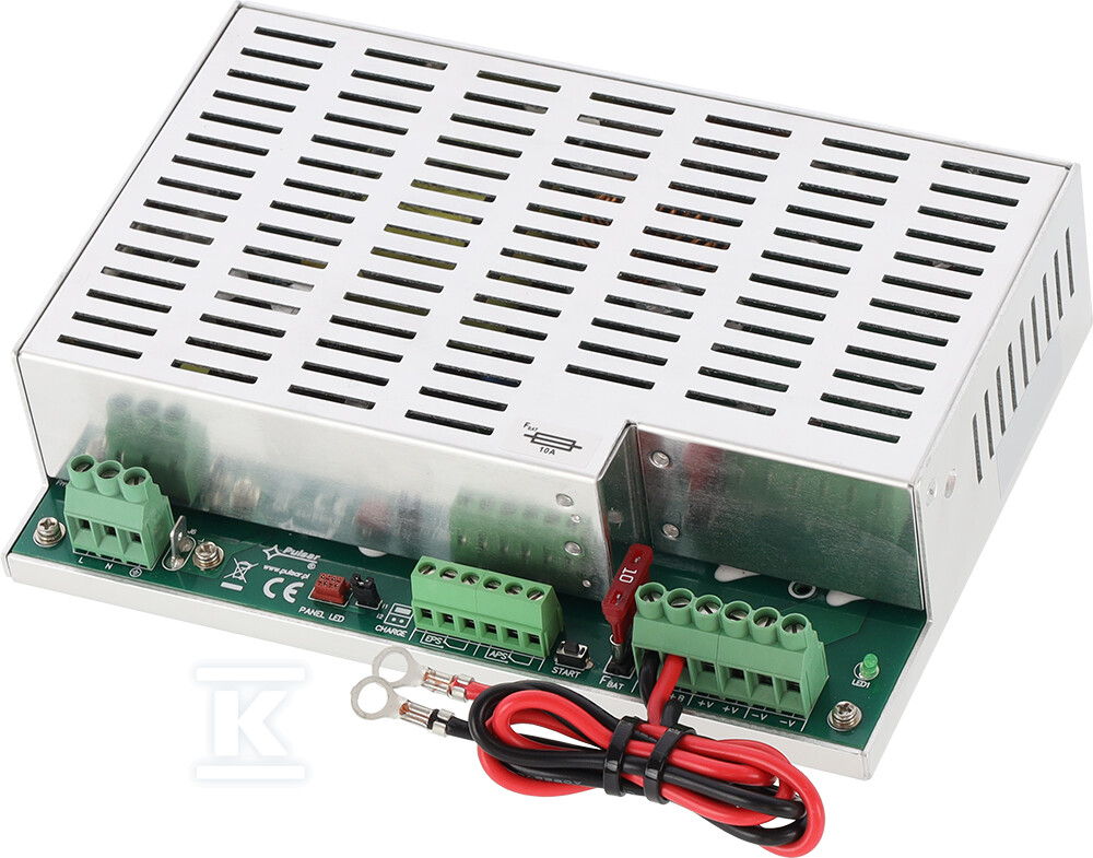 Блок живлення PSG2-12V10A має інтуїтивно зрозумілу оптичну сигналізацію за допомогою світлодіодів LED, що інформують про наявність напруги AC, напруги на виході та можливі несправності акумулятора. Доступні також технічні виходи типу релейного типу (EPS – аварія мережі AC, APS – аварія акумулятора), які дозволяють інтеграцію з системою моніторингу або сповіщень. Компактні розміри корпусу (204 x 141 x 52 mm) дозволяють легко вбудовувати в шафи стійок або корпуси сигналізаційних систем. Можливість монтажу на DIN-рейку (при використанні відповідного DIN4-тримача) додатково полегшує встановлення. Блок живлення оснащений плавким запобіжником, що захищає ланцюг акумулятора від зворотного підключення. Струм заряджання акумулятора можна встановити на 1A або 4A за допомогою перемички. Автоматичний тест акумулятора кожні 5 хвилин забезпечує його постійну працездатність.