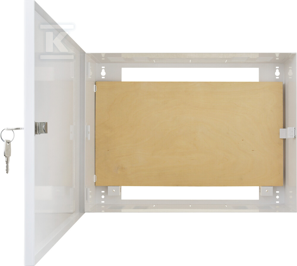 Корпус виготовлений з листової сталі DC01 з антикорозійним захистом у вигляді поліестерової фарби RAL 9003 (білий), що гарантує довговічність і стійкість до навколишнього середовища. У комплекті є монтажна плита з водостійкої фанери розміром 470x260 мм, що дозволяє стабільно закріпити пристрої. Додатковий дистаньєр 14 мм від стіни полегшує прокладання кабелів, а можливість монтажу дверцят зліва або справа збільшує гнучкість інсталяції. Замок з тим самим кодом (MR027/RAZB16) забезпечує безпеку та захист від несанкціонованого доступу.