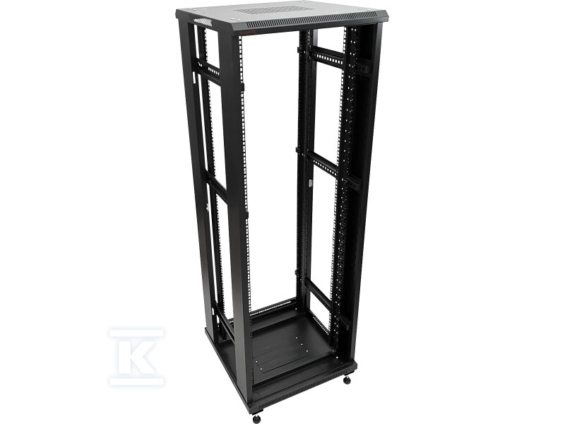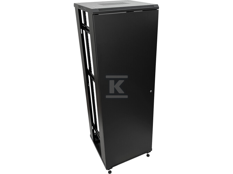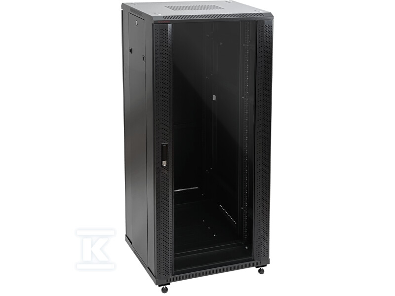 Шафа постачається у вигляді комплекту для самостійного складання (flat pack), що полегшує транспортування та зберігання. Виготовлена з міцного сталевого листа, пофарбованого порошковою фарбою в чорний колір (RAL9004), забезпечує довговічність і стійкість до корозії. Передні двері з гартованого скла, оснащені замком, гарантують безпеку обладнання та контроль доступу. Бічні кришки із замками додатково захищають вміст шафи від несанкціонованого доступу. Повна металева задня стінка забезпечує стабільність конструкції. Кабельні входи, розташовані зверху та знизу, полегшують прокладку кабелів. Шафа має 4 несучі балки та 4 регульовані ніжки – плінтус та поворотні колеса доступні для придбання окремо, що дозволяє адаптувати шафу до індивідуальних потреб.