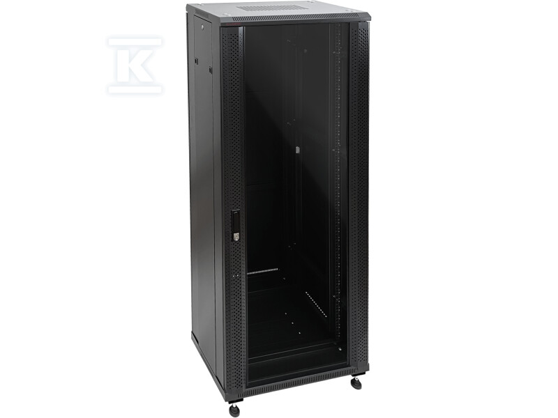 Шафа передачі даних глибиною 600 мм, призначена для установки пристроїв стандарту 19". Кожна модель має 4 стійки. Кабельні вводи, розташовані вгорі і внизу шафи, полегшують введення / вихід кабелів. Виготовлені з високоякісне загартоване скло. Бічні кришки із засувками для легкого розбирання та замком. Елементи шафи пофарбовані порошковою фарбою в чорний колір RAL9004. Шафа стоїть на регульованих ніжках (цоколь і поворотні колеса в комплект не входять) Упаковка. Шафа поставляється у вигляді FLAT PACK - набір для самостійної збірки.