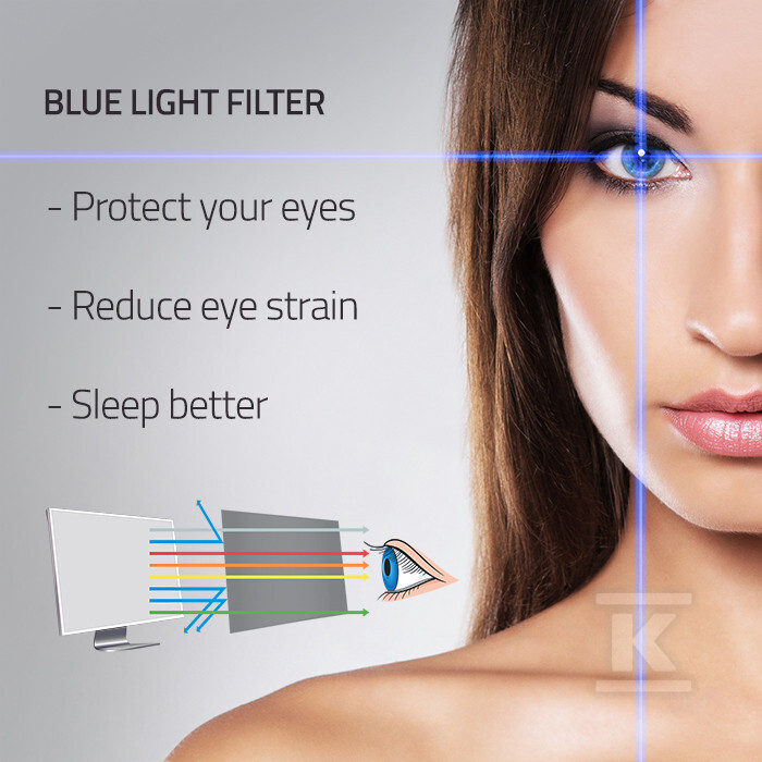 Фільтр складається з п'яти шарів, які ефективно блокують шкідливе ультрафіолетове випромінювання та зменшують кількість синього світла, що випромінюється екраном. Завдяки цьому зменшується ризик проблем зі сном і втоми очей, що перекладається на більшу продуктивність і краще самопочуття. Додатково, антиблікове покриття мінімізує відбиття та світлові перешкоди, забезпечуючи чітке зображення навіть у яскравих приміщеннях. Матова поверхня усуває відблиски та не залишає відбитків пальців, що полегшує підтримання екрану в чистоті.
