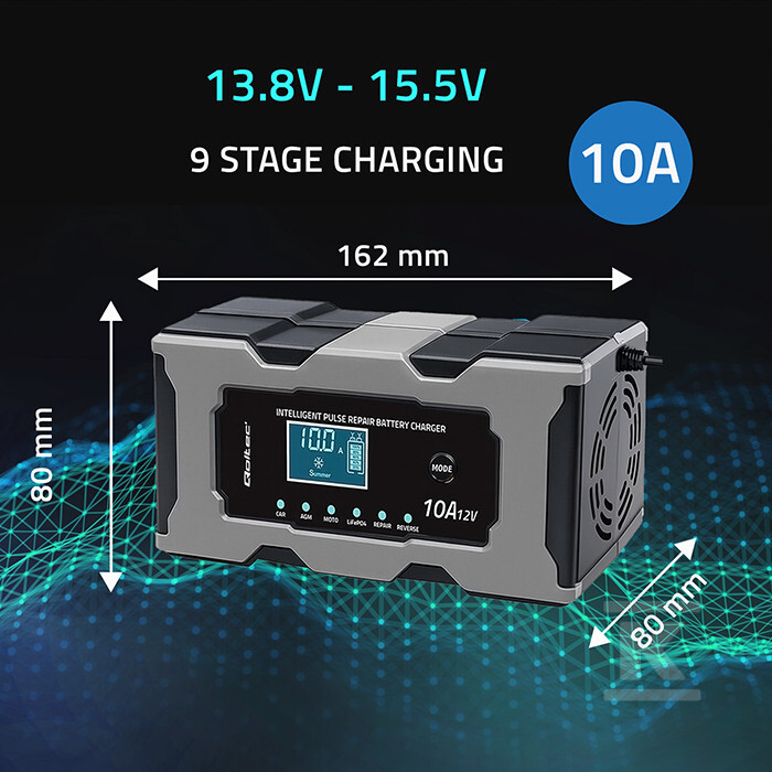Зарядний пристрій використовує 9-ступінчастий процес заряджання, що включає, серед іншого, десульфатацію, м’який старт, заряджання сталим струмом і напругою та режим підтримання. Десульфатація допомагає регенерувати зношені акумулятори, а режим підтримання підтримує їх у стані готовності протягом тривалого часу без ризику перезаряду. Вбудовані захисти захищають від зворотної полярності, перенапруги, короткого замикання та перегріву – забезпечуючи безпечну роботу пристрою. Великий LCD-дисплей показує ключові параметри заряджання: напругу, струм та поточний режим роботи. Завдяки цьому моніторинг процесу є простим та інтуїтивно зрозумілим.