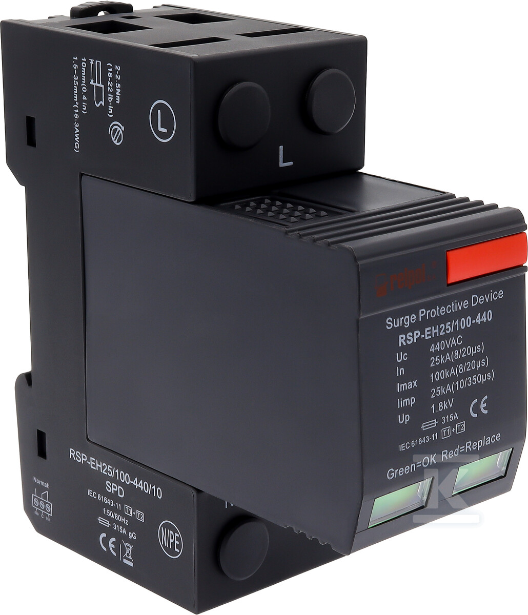 Пристрій призначений для однофазних мереж і використовує однополюсну технологію VT з напругою Uc 440V AC. Компактна ширина 36mm на полюс полегшує монтаж навіть у переповнених розподільних шафах. Крім того, обмежувач оснащений безпотенційним контактом, який дозволяє віддалено сигналізувати про пошкодження – що є надзвичайно важливим для швидкої реакції у разі аварії та мінімізації простоїв. Сигналізація стану пристрою дозволяє на проактивне управління системою захисту від перенапруг.
