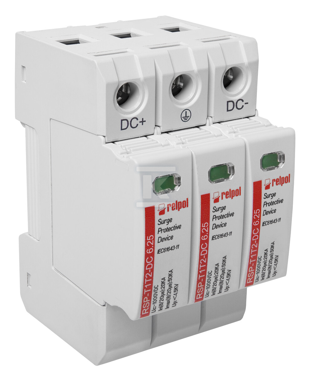 Цей триполюсний обмежувач перенапруги серії RSP-T1T2-DC розроблено для захисту інсталяцій постійного струму (DC) від наслідків атмосферних розрядів і перенапруг. Це ключовий елемент, що забезпечує безпеку пристроїв та інсталяцій, особливо в фотоелектричних системах, де стабільність напруги має критичне значення. Конструкція, заснована на варисторах MOV, гарантує швидку реакцію та ефективне придушення перешкод.