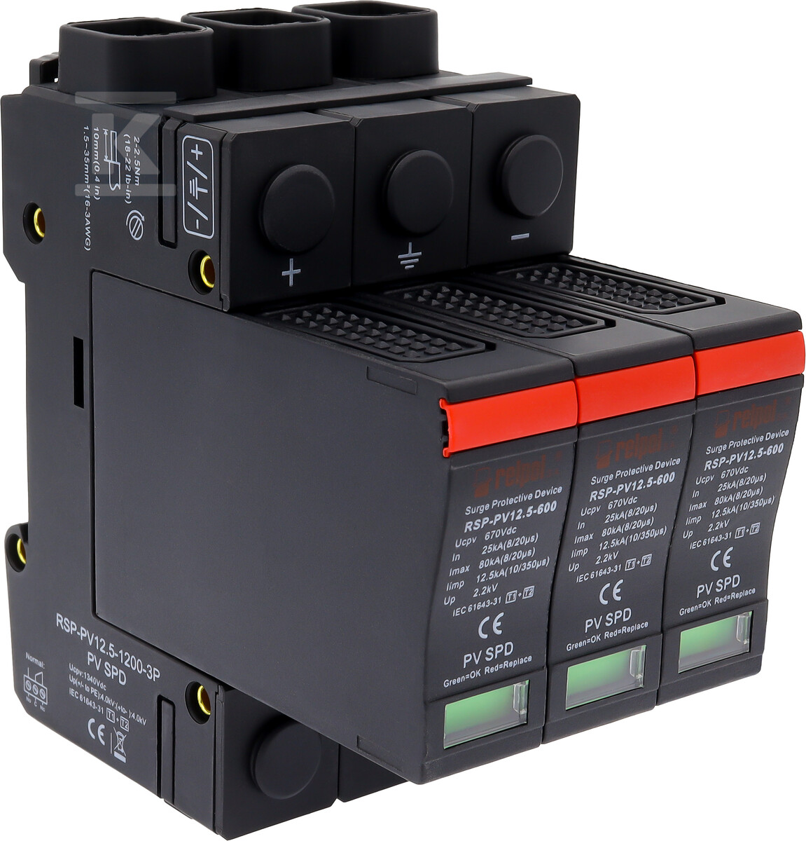 Цей триполюсний обмежувач перенапруги розроблений спеціально для захисту фотоелектричних установок постійного струму (DC). Його конструкція, заснована на технології MOV (варистор) і GDT (газовий розрядник), забезпечує комплексну захист від наслідків перенапруг, як тих, що викликані атмосферними розрядами, так і від перешкод у мережі. Це ключовий елемент, що забезпечує безпеку та безперервну роботу системи PV.