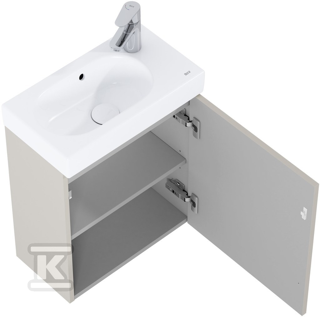 Набір складається з раковини та шафки, які утворюють єдине ціле. Оздоблення в кольорі fume mat надає йому елегантного та витонченого характеру. Функція push-to-open – відкривання фасаду шляхом легкого натискання – усуває необхідність використання традиційних ручок, що додатково підкреслює мінімалістичний вигляд.