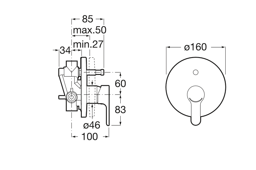 - Розетка діаметром 160 мм забезпечує естетичний вигляд і відповідність до різних стилів ванних кімнат.